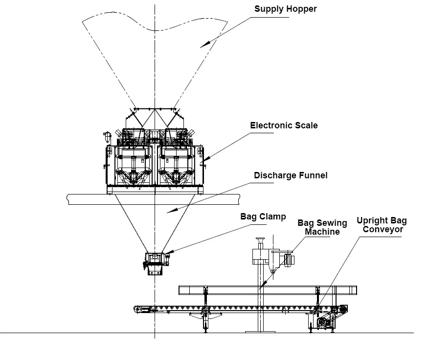 Cấu hình: Máy đóng bao tự động hoàn toàn, máy hàn nhiệt, băng tải, băng tải xử lý bao